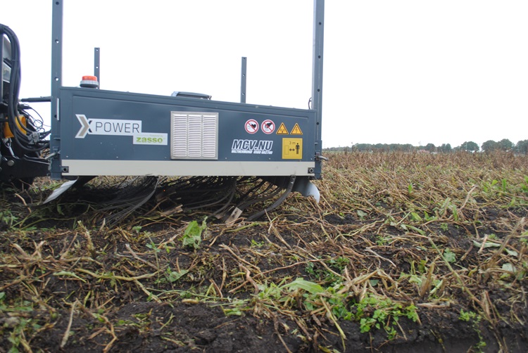 Henk Sikken kijkt tevreden naar het resultaat van zowel de Zasso als de Crown Crusher, die op zijn percelen werd gedemonstreerd. Beide methoden zijn, als het gaat om direct resultaat op het oog, niet met elkaar te vergelijken. Waar de één honderd kilovoltampère door het loof stuurt en het een aantal dagen duurt voordat het loof afsterft, gaat de ander uit van het inscheuren van het wortelgroeipunt van de aardappelstengel. Wat de Drentse akkerbouwer betreft is vooral de kostprijs van elektrificatie ‘wel een dingetje’ en ook de capaciteit met maximale snelheid van vier kilometer per uur is voor hem een discussiepunt. Op beide punten scoort de Crown Crusher van de Deense fabrikant MSR Plant Technology beter.
