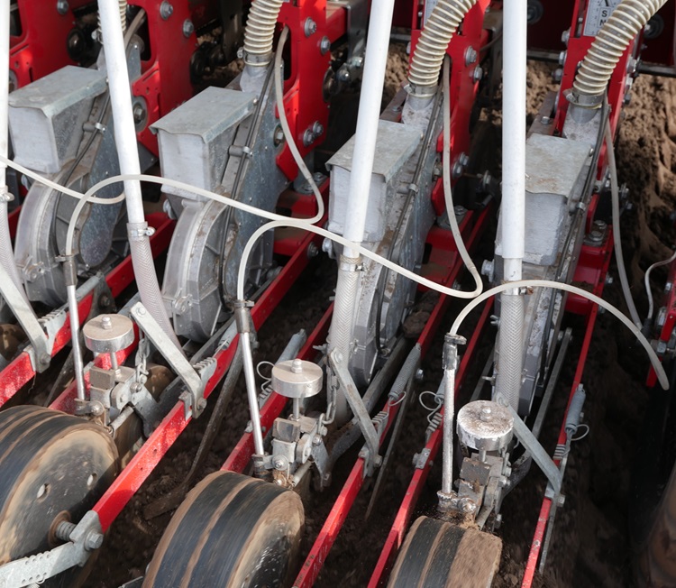 De uitstroommonden voor de vloeibare meststof zijn direct achter het zaadaandrukwiel gemonteerd. Direct na de afgifte strijken de toestrijkers de zaaivoor. Daarbij wordt de vloeistof mooi door de losse grond van de zaaivoor gemengd. De rubberen naloop rol zorgt verder voor aansluiting op de vochtige ondergrond. De aandrukschijven en de rubberen naloopwielen worden schoon gehouden met wielreinigers.