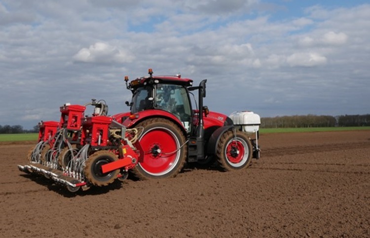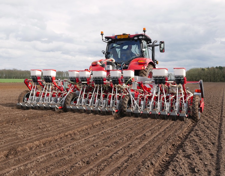 René Haaijer en Robert Oosterveld zijn vorige week zij-aan-zij vijfentwintig hectare Red Tide uien aan het zaaien op een perceel voor een ‘vroege klant’ nabij Ter Apel. De combinatie van de twee Case 145 tractoren met daarachter de zes meter brede Agricola Italiana zaaimachine kleurt mooi bij elkaar.