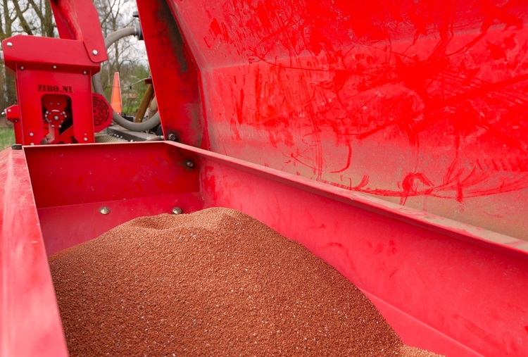 De granulaat bakken zijn hier ingezet om volvelds Nemguard (granulaat op basis van knoflookextract) toe te voegen als natuurlijk afweermiddel tegen aaltjes. Haaijer hanteert een vaste dosering van 25 kilogram per hectare. Maar hij geeft daarbij wel aan dat er de komende jaren nog veel te leren valt over wat de juiste toepassing is. “Het toedienen kan ook taakkaart gestuurd, maar in dit teeltgebied is het beter om volvelds tegen aaltjes op te treden”, aldus Haaijer.