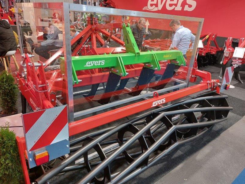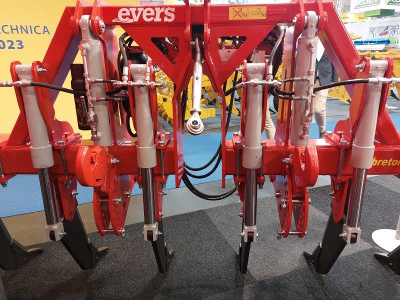 Hydraulische uitheffen is ook een vondst die Evens Agro toepast op de Forest Cultivator. Deze heeft een etageframe (groengekleurd) waarvan de werkdiepte traploos is in te stellen. Bij wielslip vanwege een taaie storende laag zorgt het, via Isobus aangestuurde, Evers Vario Compaction Control systeem ervoor, dat het etageframe automatisch uitgeheven wordt totdat de wielslip stopt. De voorste tandenrij blijft dus wel gelijkmatig op de gewenste diepte, zodat de storende laag wel doorbroken wordt.