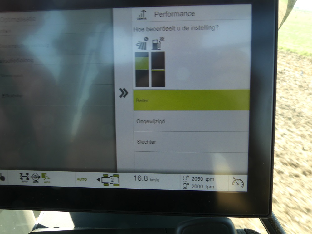 En bij de derde werkgang vraagt Cemos de machine op efficiëntie in te stellen, met als resultaat: Frontballast 600 kilogram, bandenspanning voor 0,8 bar, achter 1,0 bar, oppervlakte per uur: 3,3 per uur. Brandstofverbruik: 7,7 liter per hectare. Na afloop van elke handeling vraagt het systeem of we tevreden zijn.