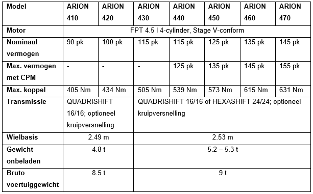 Alle modellen, van de kleinste ARION 410 tot de krachtigste ARION 470, zijn uitgerust met 4,5-liter viercilindermotoren van Fiat Powertrain, die zijn voorzien van de nieuwste vierkleppentechnologie en turboladers met intercooling.