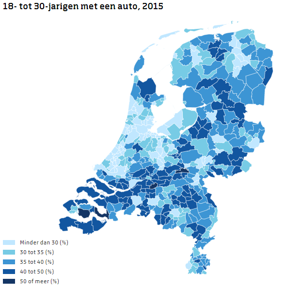 Het autobezit van jongeren die op het platteland wonen is twee keer zo hoog als van stadsjongeren. Begin 2015 had gemiddeld 1 op de 5 jongeren (18 tot 30 jaar) in de zeer stedelijke gebieden een auto. In niet stedelijke gebieden was dat 2 op de 5. Dit blijkt uit recent onderzoek van het CBS naar het autobezit van jongeren.