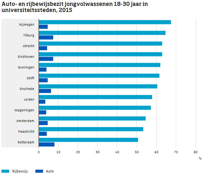 De universiteitssteden springen eruit als gemeenten waar relatief weinig jongeren een rijbewijs en auto bezitten. Van de studenten die in een universiteitsstad wonen heeft 59 procent een rijbewijs, 5 procent heeft een auto. Het autobezit is daarmee lager dan van studenten die niet in een universiteitsstad wonen. Van hen heeft 8,6 procent een auto.