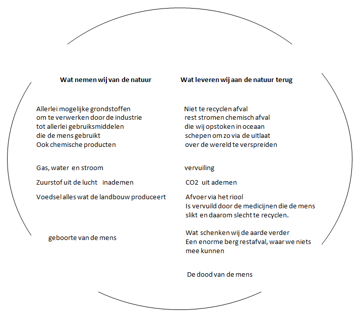 Ik denk: "Ik stel eens op wat wij gebruiken en weer terug leveren aan de natuur." Hieronder heb ik in een cirkel de kringloop van de mens gemaakt.