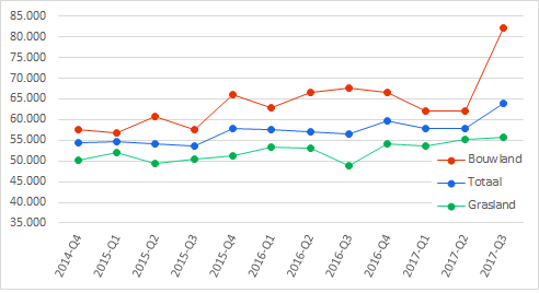 Figuur 1 – Prijs (euro/ha) onverpacht gras- en bouwland en totaal (gras-, bouw- én maïsland samen), 2014Q4 -2017Q3 (per kwartaal) Bron: Kadaster/RVO/Wageningen Economic Research
