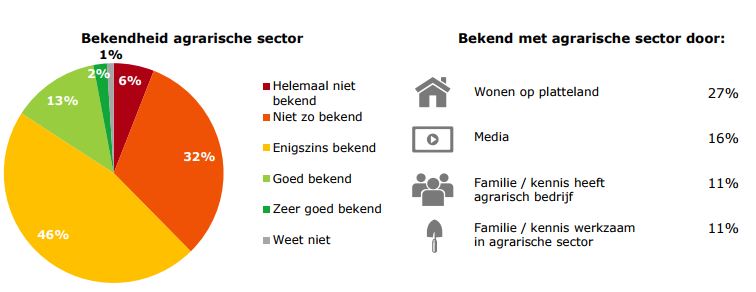 - Zes op de tien Nederlanders zijn enigszins tot goed bekend met de agrarische sector. De bekendheid met de agrarische sector komt voornamelijk omdat men op het platteland woont of familie daar heeft werken. Ook de media speelt een rol in de bekendheid.