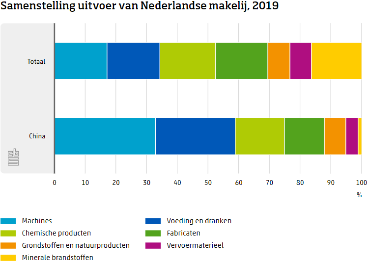 De goederen die China importeert uit Nederland verschild met het totale exportpakket van de Nederlandse fabrikanten. In 2019 bestond een derde van de export naar China uit machines. Dit is twee keer zoveel dan het totale exportpakket, hierin wordt een zesde deel aan machines geëxporteerd. Hetzelfde geld voor de voedingsproducten.