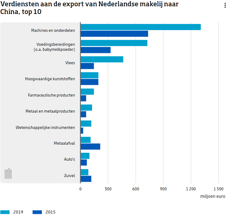 In de eerste vier maanden van 2020 is de export van goederen van Nederlandse makelij naar China met 500 miljoen euro gestegen tot 3,5 miljard euro. Dat is 16 procent meer dan in dezelfde periode in 2019. Vooral de verdiensten aan de export van machines en ook voeding zijn gestegen.