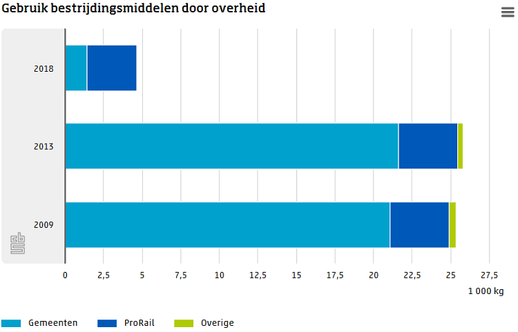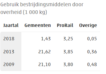 Nederlandse overheidsinstellingen zoals gemeenten, ProRail, waterschappen, provincies, defensie en Rijkswaterstaat, hebben in 2018 bijna 5 duizend kilogram bestrijdingsmiddelen gebruikt. Dat is ongeveer 82 procent minder dan vijf jaar eerder. Het resterend gebruik is vooral ingezet bij het onderhoud van het spoor. Ook daar is een daling te zien, al is die wel minder groot. Dit blijkt uit nieuwe cijfers van het CBS.