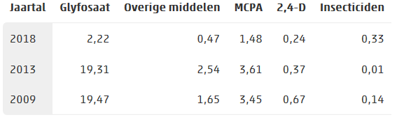 Overheidsinstellingen maken veel minder gebruik van glyfosaat, ook wel bekend onder de merknaam Roundup. In 2018 werd er voor 2 219 kilogram aan glyfosaat ingezet in opdracht van Nederlandse overheidsdiensten. Dat is bijna 90 procent minder dan in 2013. In dat jaar werd er nog 19 307 kilogram gebruikt. Toen was chemische bestrijding van onkruiden op verhardingen nog toegestaan.