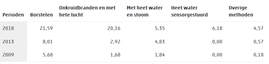 In 2013 besloeg het areaal verhardingen waarop gemeenten chemische bestrijdingsmiddelen gebruikten nog bijna 22 duizend hectare. Nu bestrijdingsmiddelen daar niet meer zijn toegestaan was dat oppervlakte in 2018 nihil. Er wordt steeds vaker naar alternatieve onkruidbeheersmethoden zoals borstelen of branden gegrepen. Ook de bestrijding met heet water of stoom neemt toe. De methoden worden met sensorsturing steeds preciezer.
