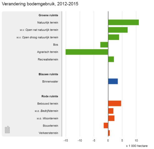 Tussen 2012 en 2015 wijzigde 45 duizend hectare van bestemming, bijna 1 procent van de totale oppervlakte van Nederland. Met name agrarisch terrein kreeg een andere gebruiksfunctie: ruim 15 duizend hectare land- en tuinbouwgrond kreeg een andere bestemming. Dit betekent dat op een doorsneedag ongeveer 14 hectare aan de landbouw is onttrokken, een oppervlakte vergelijkbaar met 28 voetbalvelden. Dit beeld is de laatste dertig jaar nauwelijks veranderd. Ook 1,5 duizend hectare bouwterrein, voorheen vaak agrarisch terrein, kreeg een nieuwe gebruiksfunctie.