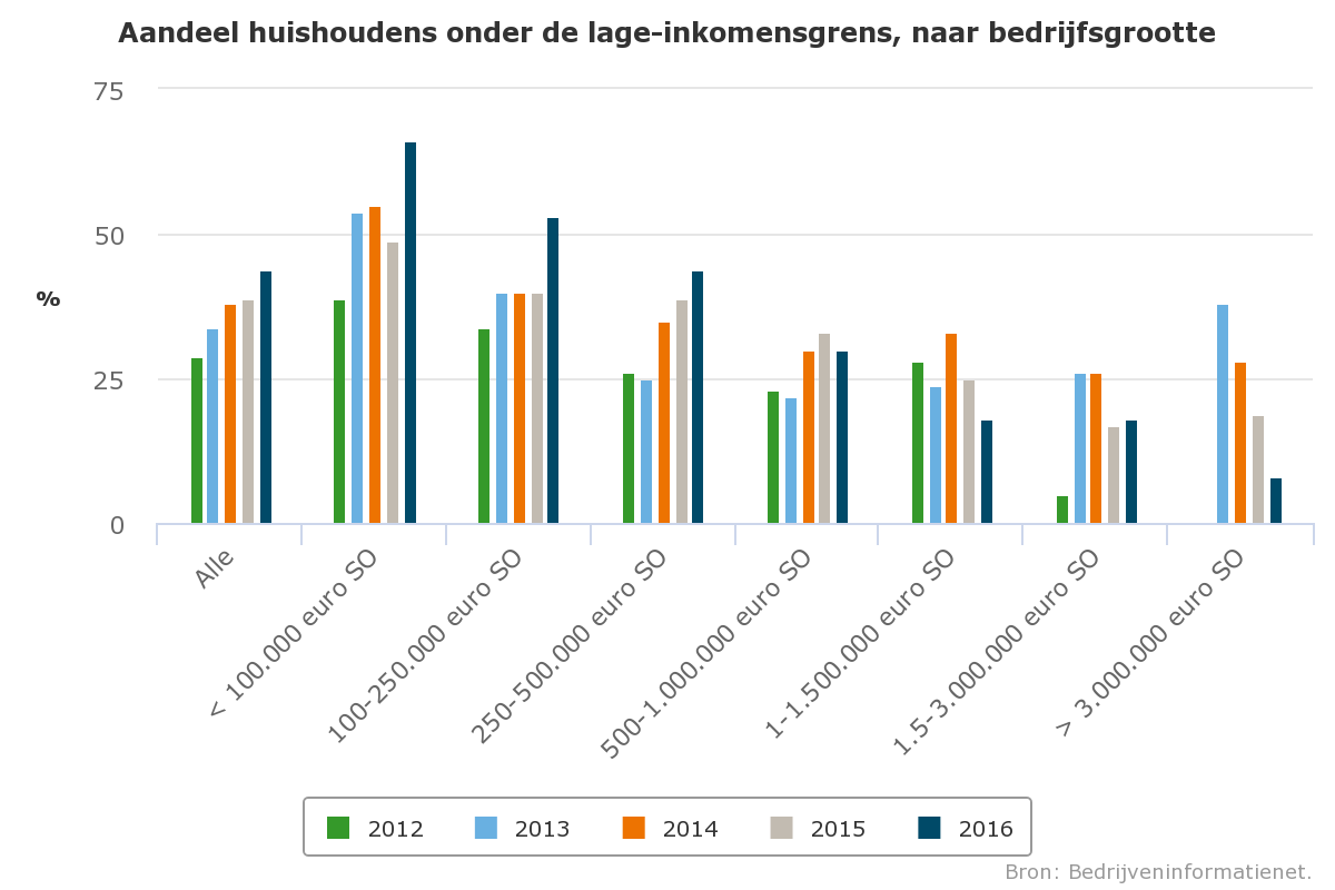 De lage-inkomensproblematiek speelt zowel op grote als op kleine bedrijven, gemeten in euro Standaardopbrengst (SO). In 2012, 2015 en 2016, wat gemiddeld genomen goede inkomensjaren waren, is het relatieve aandeel huishoudens onder de lage inkomensgrens het grootst op de kleinere bedrijven (tot 250.000 euro SO). De grootste bedrijven (1,5–3 mln. euro SO) zijn voornamelijk te vinden in de glastuinbouw en intensieve veehouderij en relatief sterk vertegenwoordigd in de groep met lage inkomens in een jaar met lagere inkomens zoals 2013 en 2014. Kleine schommelingen in prijsmutaties, zowel positief als negatief, van producten werken sterk door in de resultaten van grote bedrijven.