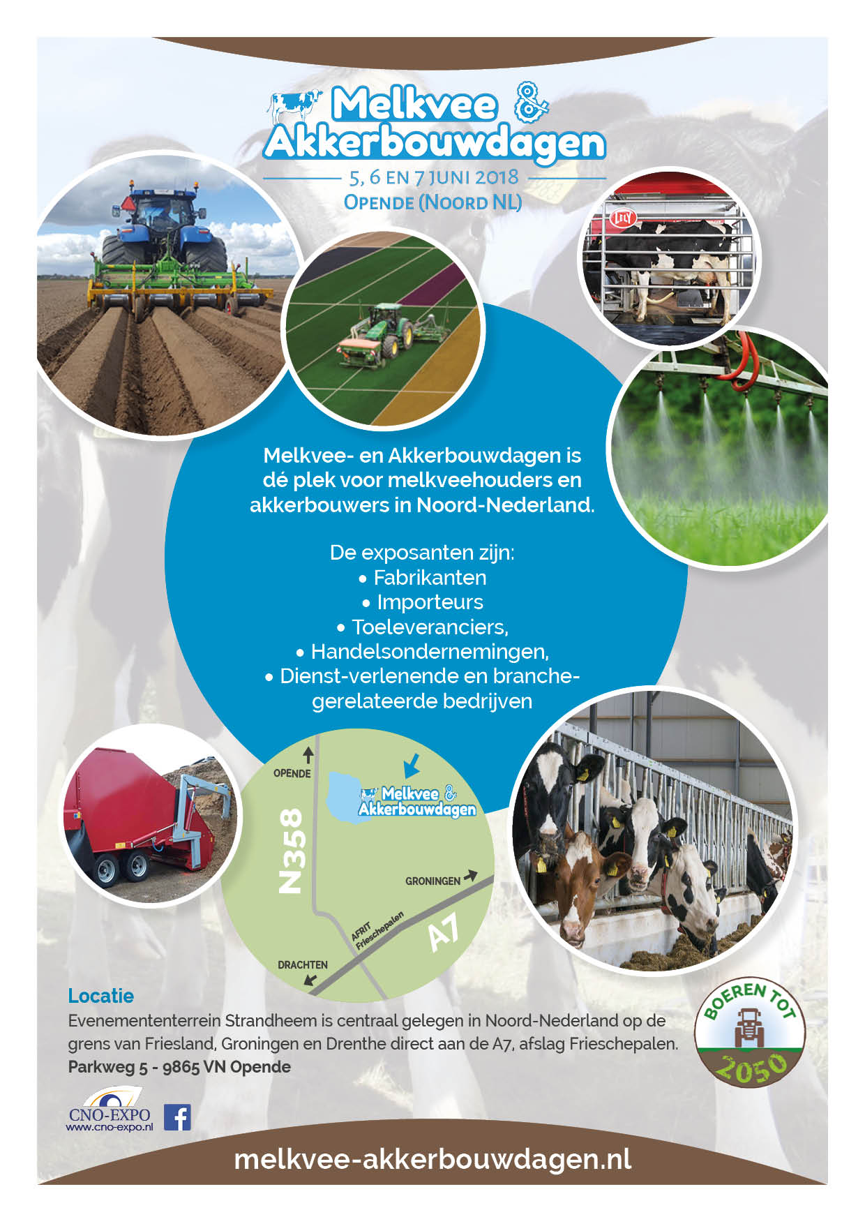Op dinsdag 5 juni aanstaande starten de Melkvee- en Akkerbouwdagen Noord-Nederland aan de A7 in Opende. U ben hier van harte welkom.