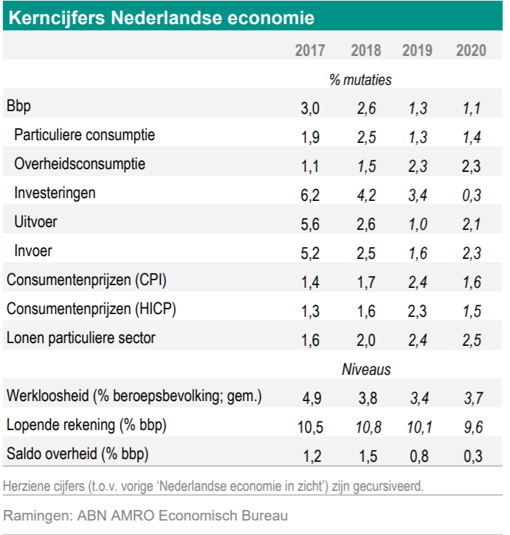 - De groei van de Nederlandse economie vertraagt verder naar 1,3% dit jaar en 1,1% in 2020, en valt daarmee lager uit dan we eerder dachten – vooral in 2020