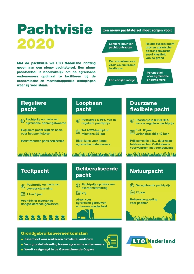 “Pacht is een belangrijk instrument voor boeren om te kunnen blijven boeren. Met de Pachtvisie 2020 wil LTO Nederland van onderop richting geven aan beleid. Een nieuw pachtstelsel is noodzakelijk om boeren en tuinders optimaal te faciliteren bij de economische en maatschappelijke uitdagingen van vandaag en morgen. Het moet een stimulans zijn voor een vitale en duurzame landbouw met perspectief voor agrarische ondernemers,” aldus Alfred Jansen, portefeuillehouder Veiligheid & Pacht. “Pachtcontracten met een langere duur en een relatie tussen de pachtprijs en de agrarische opbrengstwaarde en de kwaliteit van de grond zijn noodzakelijk om tot een eerlijke marge te komen. Met de Pachtvisie 2020 wil LTO de leden een goede toekomst geven in een nieuw uitgebalanceerd pachtstelsel.”