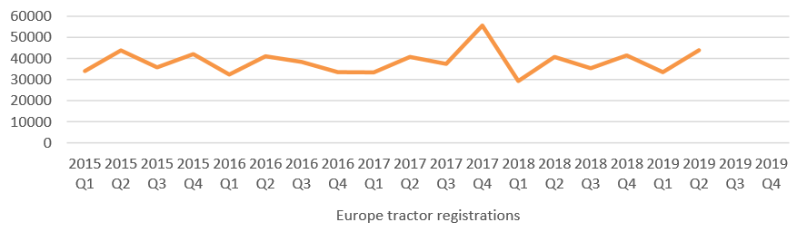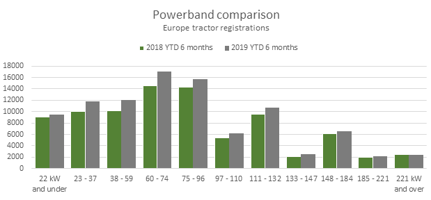 In totaal werden in de eerste zes maanden van 2019 ongeveer 96.428 tractoren in heel Europa geregistreerd, volgens cijfers van de nationale autoriteiten. Van deze registraties waren 21.285 trekkers 37 kW (50 pk) en minder, en 75.143 waren 38 kW en meer. CEMA is van mening dat 77.383 van deze voertuigen landbouwtrekkers zijn, de rest quads, verreikers of andere werktuigen.