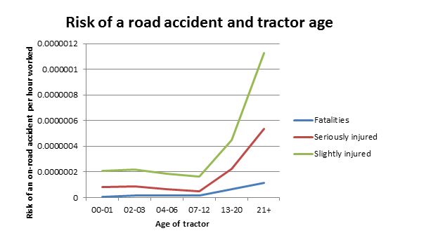 Het risico om betrokken te raken bij een verkeersongeval is aanzienlijk lager wanneer men in nieuwe machines rijdt. In overweging genomen dat nieuwe tractoren veel intenser worden gebruikt dan oudere apparatuur, is de effectieve verkeersongeval risico voor trekkers die minder dan 13 jaar in gebruik zijn zelfs 82% lager per gewerkt uur in vergelijking met oudere machines.