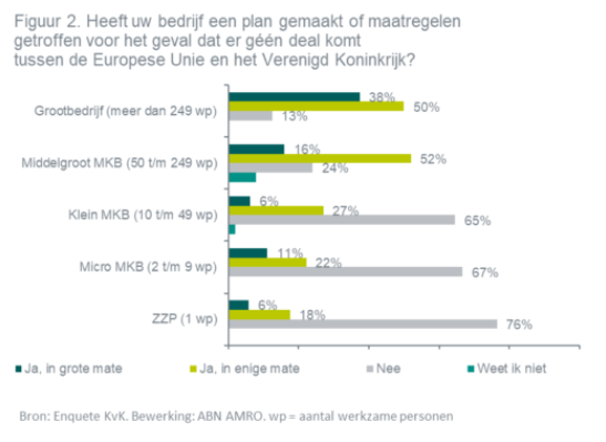 Van de acht grootbedrijven die reageerden, zien er vijf de post-brexit-toekomst zonning is. Dat komt neer op 63%. Hoe komt dit? "Grote bedrijven denken dat de brexit hen een concurrentievoordeel geeft ten opzichte van kleinere bedrijven", zegt KvK-onderzoeker Marco van Hagen. "Bovendien hebben ze zich over het algemeen beter voorbereid op wat komen gaat dan kleinere bedrijven". Maar ook onder de kleinere bedrijven, waaronder veel micro-mkb'ers, bevinden zich veel 'optimisten'. "Zij hebben zich weliswaar veel minder goed voorbereid op een brexit, maar omdat ze momenteel conjunctureel de wind in de rug hebben, zijn ze relatief optimistisch", aldus Van Hagen.