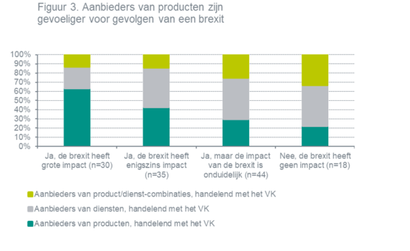 Op verzoek van ABN AMRO vroeg de KvK aan de ondernemers om aan te geven welke gevolgen ze van de brexit verwachten in relatie tot het type product of dienst dat ze aanbieden. Hieruit blijkt dat ondernemers die louter producten verkopen relatief vaak verwachten dat een brexit een betrekkelijk grote impact op hun bedrijf gaat krijgen. Leveranciers een combinatie van een product en een dienst aanbieden, denken minder beïnvloed te worden door een brexit. Denk bij die laatste categorie aan een leverancier van een voedselverwerkingslijn die daarna zelf het onderhoud aan de machines blijft uitvoeren. Of een reisaanbieder die boekingen verzorgt en vervolgens zelf de tenten of chalets uitbaat.