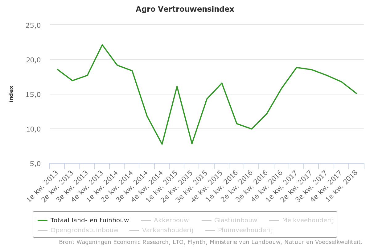 De Agro Vertrouwensindex voor de totale land- en tuinbouw is in het eerste kwartaal van 2018 voor de vierde keer op rij licht gedaald. De Agro Vertrouwensindex daalde met ongeveer 1 punt ten opzichte van het vierde kwartaal van 2017. In een jaar tijd daalde de index slechts 4 punten; 1 punt per kwartaal.