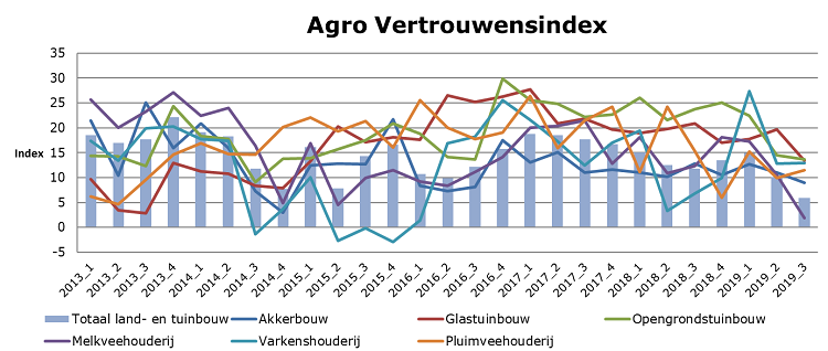De Agro Vertrouwensindex is in het derde kwartaal van 2019 opnieuw gedaald. De index daalde met 4,2 punten en staat nu op een kleine 6 punten. Hoewel niet eerder zo’n lage index gemeten is sinds de start in 2013, zijn nog altijd meer boeren en tuinders positief dan negatief gestemd.