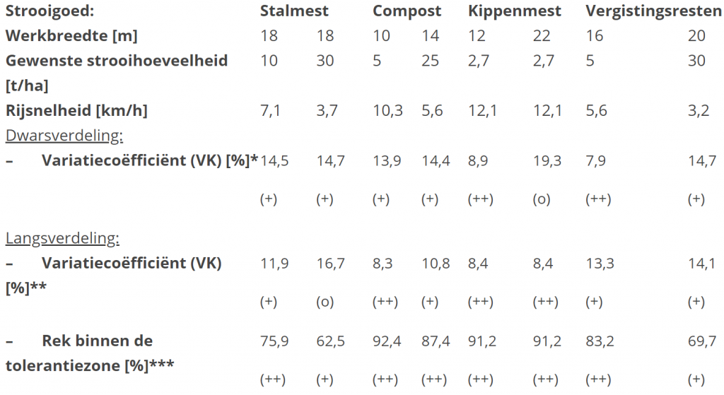 De vastgestelde variatiecoëfficiënten voor het beoordelen van de dwarsverdeling liggen bij elk van de vier soorten strooigoed onder 20% en worden voor mest en compost bij beide strooihoeveelheden met goed (+) beoordeeld. De dwarsverdeling van kippenmest wordt bij een werkbreedte van 12 meter met zeer goed (++) en bij 22 meter met voldoende (o) beoordeeld. Bij vergistingsresten wordt de dwarsverdeling bij een strooihoeveelheid van 5 t/ha en de bijbehorende werkbreedte van 16 meter met zeer goed (++) en bij 30 t/ha en een werkbreedte van 20 meter met goed (+) beoordeeld.