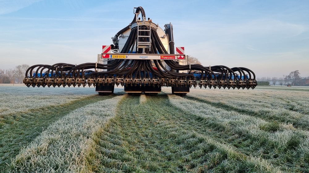 De graslanden in de buurt van het Utrechtse Maarsbergen zijn van een eerste gift drijfmest voorzien door een splinternieuwe Duport 4-in-line-flex in combinatie met een All-track 870 Twin bemester. Loonbedrijf Moesbergen Verhuur heeft in de eerste bemestingsronde zo’n zestienduizend kuub met de ‘capaciteitsmachine’ uitgereden. “Dit bevalt buitengewoon goed”, aldus eigenaar Jurriaan Moesbergen.