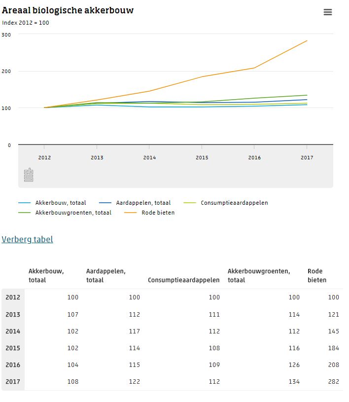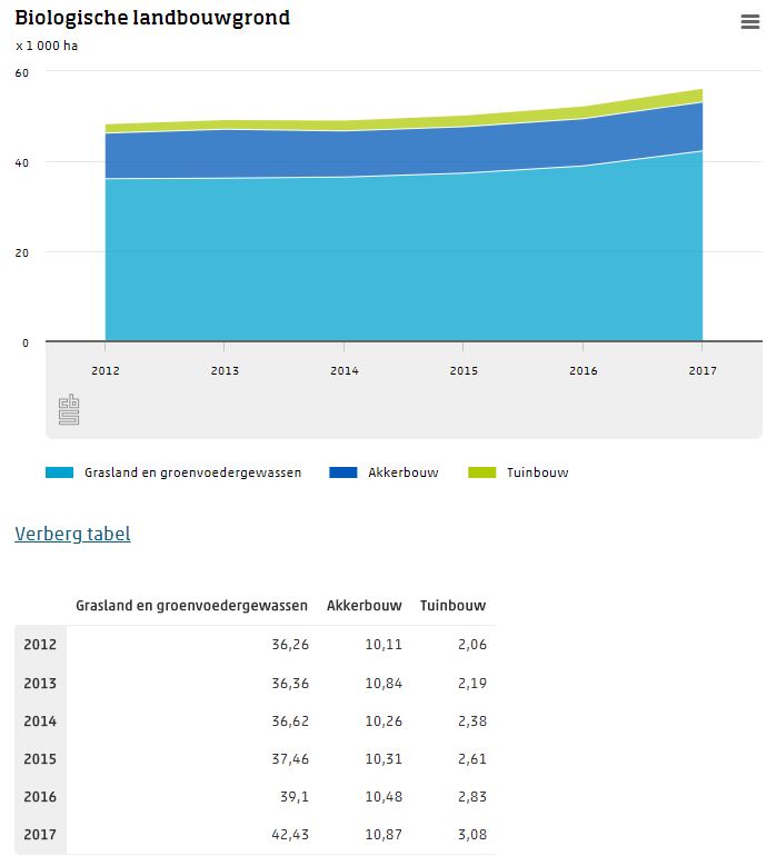 De oppervlakte landbouwgrond voor biologische landbouw is tussen 2016 en 2017 met 7,6 procent toegenomen tot circa 56,4 duizend hectare. De groei van de biologische melkveehouderij is goed merkbaar in de toename van het areaal biologisch grasland dat onder andere beschikbaar is voor de melkveehouderij. Dat groeide met 8,8 procent naar 40,1 duizend hectare. In 2017 was 19,3 procent van het biologische landbouwareaal, zo’n 10,9 duizend hectare, in gebruik voor de akkerbouw. Dit areaal nam in een jaar tijd met 3,8 procent toe.