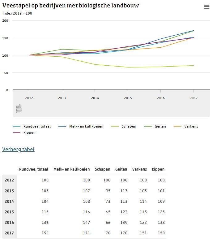 De biologische veestapel groeide met 8,9 procent naar ruim 3,5 miljoen dieren. Vooral het aantal geiten en varkens nam tussen 2016 en 2017 toe. Van de totale veestapel in Nederland was vorig jaar 2,9 procent biologisch. In 2016 was dat nog 2,6 procent.