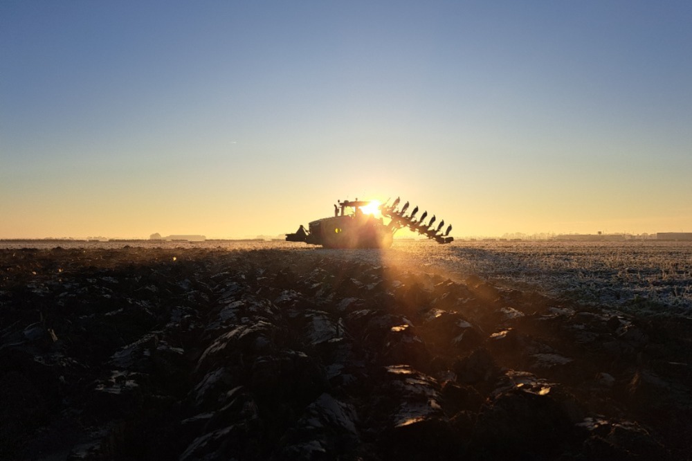 De ochtendzon schijnt over de bevroren overblijfselen van de bladrammenas schijnt, wat medewerker Albert Spelde van Van Liere Landbouw uit Dronten vervolgens onderploegt. De John Deere 8335 RT met rupsuitvoering kan de bevroren grond makkelijk aan. Terwijl de vogels op zoek zijn naar iets lekkers in de dampende grond, stap ik in de warme cabine en ga het gesprek met hem aan.