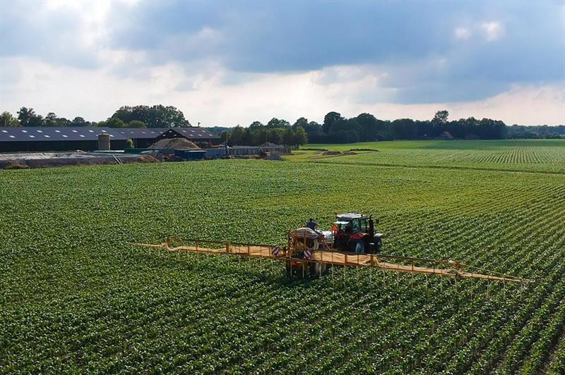 De basis is een afgeschreven getrokken veldspuit van Dubex. “De bomen waren 27 meter. Daar hebben we de buitenste anderhalve meter van af gehaald. Zo kom je op een breedte van 24 meter. Hiermee kunnen we 32 rijen met een rijafstand van 75 centimeter pakken. Met deze capaciteit kun je flink opschieten. Honderdvijftig hectare werk je zo weg.”