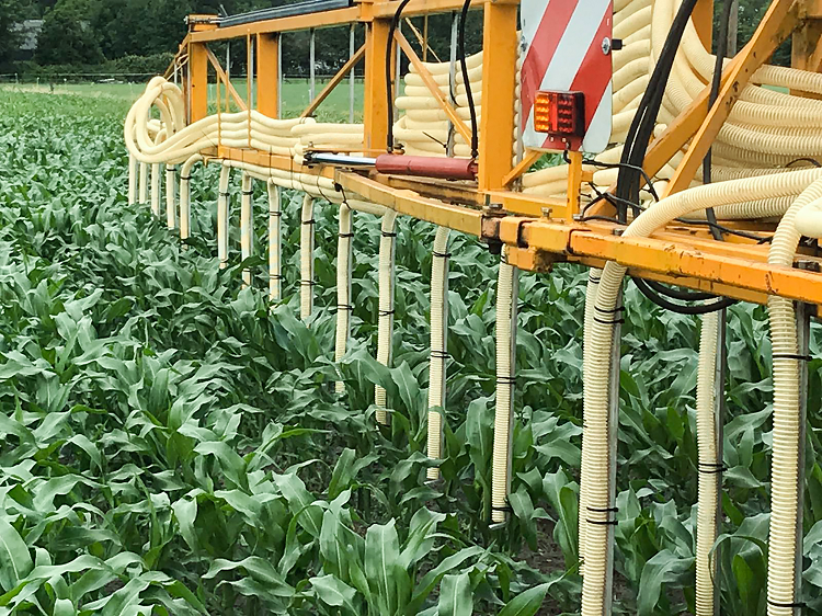 Alle spuittechnieken zijn van de veldspuit verwijderd. Behalve de hydraulische cilinders voor het opklappen van de spuitboomarmen. De leidingen voor de vloeistoffen zijn vervangen door kunststof slangen waar het graszaad doorheen gaat. Uiteindelijk wordt het graszaad met luchtondersteuning onder de maisplanten gelegd. “Dit ligt los op het land. We willen zo laat mogelijk in het jaar het graszaad zaaien. Je wilt immers een zo optimale groei van de maisplant. Als die op ‘navelhoogte’ is, gaan we met onze onderzaaimachine het land in.”
