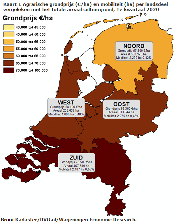 In landsdeel West is de gemiddelde agrarische grondprijs in het 1e kwartaal van 2020 met 25% gestegen: van € 54.400 (4e kwartaal 2019) tot € 68.100 per ha. Het jaargemiddelde voor 2019 bedraagt € 57.200 per ha. De grondmobiliteit is in landsdeel West met 21% afgenomen: van 4.700 ha in de periode 2018Q2-2019Q1 tot 3.700 ha over de laatste 4 kwartalen (2019Q2-2020Q1). De relatieve grondmobiliteit over de laatste 4 kwartalen komt uit op 1,8%, tegen 2,2% in dezelfde periode het jaar daarvoor.