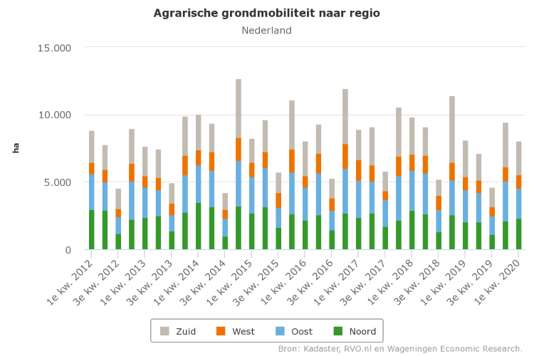 Gemeten over de laatste vier kwartalen (2019Q2 tot en met 2020Q1) is in totaal 29.300 ha grond in andere handen overgegaan, dat is 14% minder dan de 33.900 ha in dezelfde periode een jaar eerder (2018Q2-2019Q1). De relatieve grondmobiliteit – het verhandeld areaal afgezet tegen het totaal areaal landbouwgrond – over de vier laatste kwartalen bedraagt 1,7%, tegen 1,9% in dezelfde periode het jaar daarvoor.