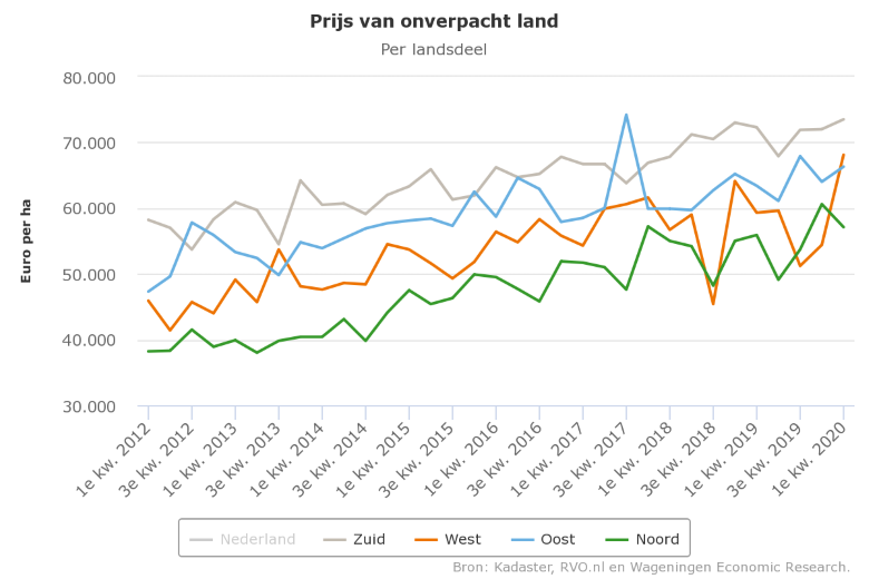 De gemiddelde agrarische grondprijs in Nederland is in het 1e kwartaal van 2020 uitgekomen op € 64.400 per ha. Dat is vrijwel gelijk aan de prijs in het 4e kwartaal van 2019, maar 4% hoger dan de gemiddelde prijs van € 61.900 per ha over heel 2019.