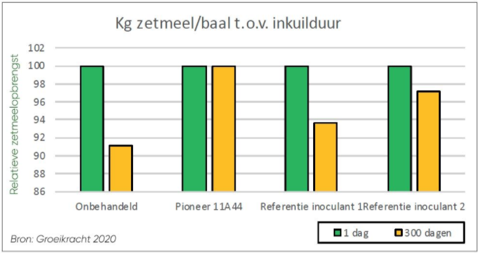 Bij dit onderzoek zijn balen gemaakt en is de voederwaarde bepaald een eerste keer bij de oogst en een tweede keer na 300 dagen. De onbehandelde balen hadden na 300 dagen 9% minder zetmeel. De balen behandeld met 11A44 verloren geen zetmeel. Een hectare mais levert ongeveer 17 ton drogestof x 380 zetmeel= 6500 kg zetmeel. Dus men behoudt door gebruik van 11A44 6500 x 9%= 600 kilogram zetmeel per hectare!