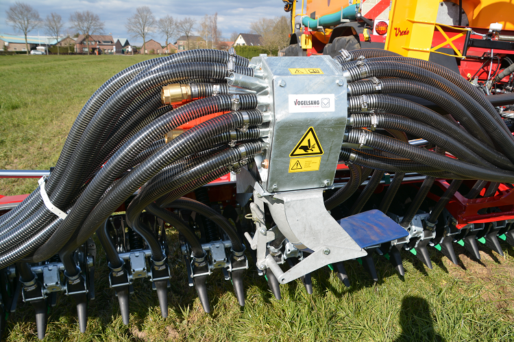 Voor exactere verdeling heeft Vredo gekozen voor 2 Vogelsang Exacut ECQ verdelers. Dankzij het grote deksel aan de achterzijde kan men eenvoudig bij slijtdelen. Uitgevoerd met 40 mm slangen voor nauwkeurige precisiebemesting, gewichtsreductie en langere levensduur.
