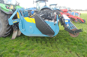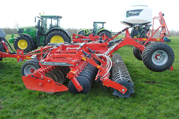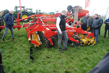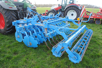 Voor de aardigheid werd de hondstrouwe en onverwoestbare Smaragd van de proefboerderij, die inmiddels in de markt al is opgevolgd door Kristal, uitgestald. De Rubin 10 schijveneg is desalniettemin de blikvanger van Lemken. “De schijven hebben een diameter van 645 millimeter, waarbij de bolling zorgt voor het loswerken van de grond en maken een werkdiepte tot 14 centimeter mogelijk”, legt Hans Hoogland van Lemken uit. De schijfstelling (Hoogland: “Trekt nooit scheef”) is schuin, waardoor optimale indringing en vlakvullend werken mogelijk is. “Dit levert een optimaal meng- en verkruimelresultaat op.” De holle schijven zijn afzonderlijk op een beugel van gehard staal gemonteerd. Twee verdeeleggen, die achter de schijven aangebracht zijn en in hoogte en schuinte versteld kunnen worden, controleren hoe de stroom grond en gewas wordt afgegeven. Tegelijkertijd verbeteren ze de stroverdeling, terwijl er diagonaal op de dorsrichting wordt gereden.