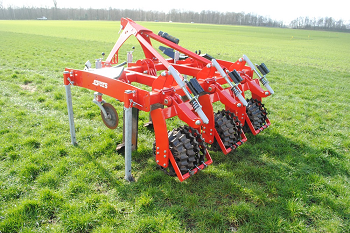 Jan Kozenbrink van Kverneland geeft aan dat de fabrikant een ‘eigenaardige’ schijveneg heeft ontwikkeld. Het onderscheidende kenmerk zit vooral in de vlakke conische schijven met kleine kartels. “Die snijden de bodem af, zeg maar. De kleine kartels leveren ook minder slijtage op. De geveerde armen zorgen voor de indringende werking.” Aan de voorkant zijn wielen geplaats om stabiliteit te geven. “De rol achter de machine moet het dekentje met vegetatie aandrukken voor de capillaire werking.” De uitvoering bij de Groenbemesterdag is uitgevoerd met een A-drill 500 pneumatische zaaimachine. “Met ketsplaatsjes voor de rol.”