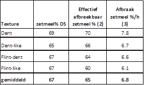 De bovenstaande tabel laat een groot verschil zien tussen puur Dent- en puur Flintmais in zetmeelverteerbaarheid op pensniveau. Ook de tussenvormen laten een betere en snellere vertering zien op pensniveau. De puur Dentmais scoort echter het beste. Pioneer heeft een ruim assortiment van Dent maissoorten in alle vroegheidsgroepen: