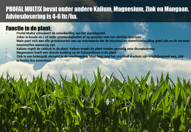 Profal Multix is een innovatief product dat breed inzetbaar is en voor alle soorten maïs gebruikt kan worden. De ideale situatie voor goede maïs is verbouwen op luchtige grond met veel humus. Dit noemen we het klei-humus effect oftewel de CEC: het vermogen om nutriënten en water vast te houden. Helaas is die ideale situatie vrijwel nooit aanwezig. Voor maïstelers die niet die luxe hebben is Profal Multix een zeer geschikte oplossing: “Officieel is Profal Multix een bladmeststof, maar het heeft ook een enorme goede bodemwerking. Vooral op niet mobiele gronden die koud, nat en kleiachtig zijn heeft men veel baat bij dit product. Ook in ijzerhoudende kalkgronden zorgt het voor optimale groei, vooral in de jonge delen van de plant (daar waar zink- en fosfaatgebrek meestal als eerste optreden). We spreken hier dan ook van een startereffect.”