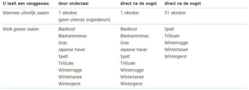 Er zijn verschillende uiterlijke datums om uw vanggewas te zaaien. De datum hangt af van het soort maïs dat u teelt en hoe u uw vanggewas teelt. In de tabellen hieronder leest u per maïssoort wanneer u uiterlijk het vanggewas teelt en welk vanggewas u mag zaaien. In de Gecombineerde Opgave geeft u bij het maïsperceel het vanggewas als volgteelt op. Doorgeven kan uiterlijk 1 oktober. U geeft ook de gewassen die u voor 31 oktober moet telen door.