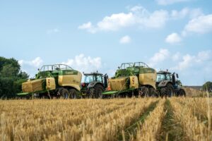 “Hierdoor kunnen we de machine het hele seizoen goed inzetten. Ook onder natte omstandigheden is er geen sprake van ‘baalstilstand’. De chauffeur kan met een druk op de knop de baaldiameter aanpassen. De satelliet gaat omhoog of omlaag en je kunt door naar een volgende klus. De dubbele meelopende aandrijving en dubbele spanarm zijn bovendien een extra zekerheid.”