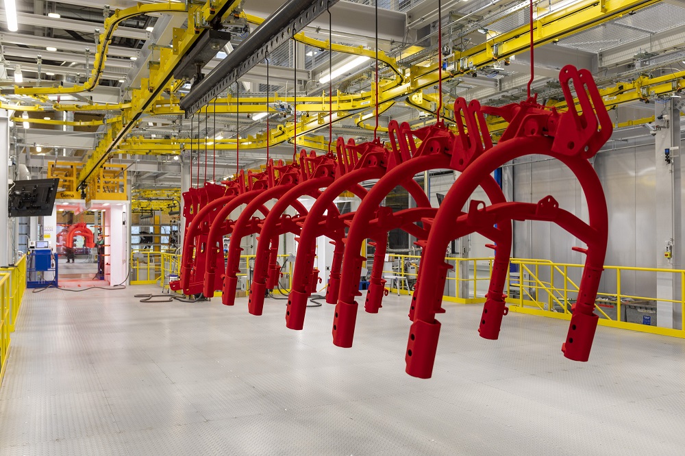 De nieuwe grond- en laklijn geeft nu de onderdelen voor harken en rondebalenpersen hun kleurrijke verflaag. Deze onderdelen werden voorheen vanuit de lakstraat op de hoofdvestiging in Grieskirchen aangeleverd. Bovendien trekken geavanceerde methoden contractorders aan van externe bedrijven die hoogwaardige coatings nodig hebben. Dankzij de geavanceerde lay-out van de verflijn kunnen bestellingen zijn uitgevoerd in zwart CDP met hoge wanddiktes en zware eenheidsgewichten. De maximale zwevende last is 1.200 kg.