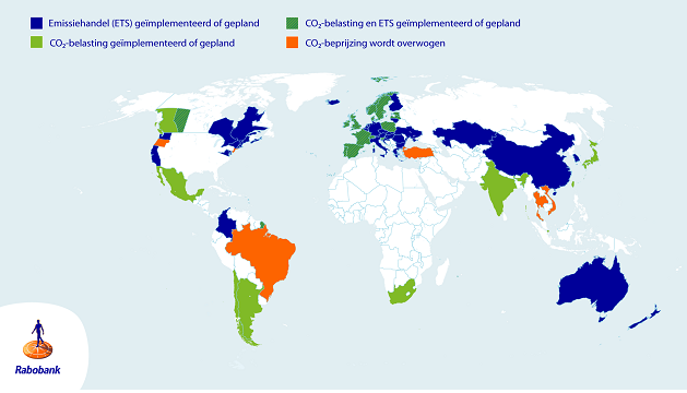 Figuur 1: CO2-beprijzingsinitiatieven bestaand of gepland, en overwogen (Bron: Rabobank)