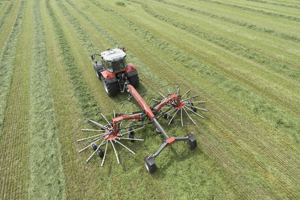 - Zes dubbelrotorzwadharken met werkbreedtes van 7,6 m tot 10 m