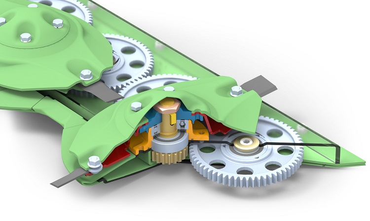 Voor de ontwikkeling van de schijvenmaaiers – SaMASZ bouwt ook trommelmaaiers – en dan vooral voor de ontwikkeling van het hart van de schijvenmaaiers, de maaibalk, keek SaMASZ goed naar de constructie van enkele leidende Duitse merken. “Het bedrijf heeft aanvankelijk niet voorop willen lopen met innovaties hoewel dat de laatste jaren aan het veranderen is. Vooral na de komst van een nieuw hoofd ontwikkeling die ambitieuze plannen aan het opzetten is”, zegt Jans. De professionele PerfectCUT-maaibalk kenmerkt zich door een aandrijving met grote tandwielen achter de maaischijven. Zij drijven beurtelings de kleine tandwielen onder de maaischijven aan die vijf keer zo snel draaien als de aandrijf tandwielen. Deze constructie moet resulteren in een relatief laag geluidsniveau. De maaibalk zelf is volledig gelast en dat maakt ‘m stijf maar tegelijkertijd ook zwaar. Volgens Jans is de geschiktheid voor zware omstandigheden de reden dat het Ierse McHale voor haar maaiers gekozen heeft voor de PerfectCUT-maaibalk van SaMASZ.